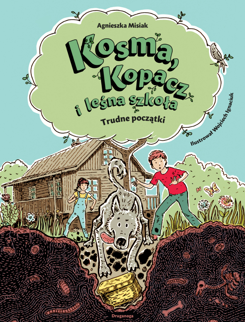 Kosma ma prawie osiem lat, poczucie humoru i wyjątkowy zmysł obserwacji. Zna się na emocjach (nie tylko swoich). Wie, co zrobić, gdy jest za głośno albo gdy siedzenie bez ruchu staje się torturą. Pewnego dnia w jego życiu pojawia się pies. To dzięki niemu Kosma poznaje Sandrę, która gryzie swój warkocz, gdy się denerwuje, i ma zadatki na najlepszą przyjaciółkę - taką, z którą buduje się bazy, biega po lesie i marzy o... leśnej szkole. Kiedy dzieci postanawiają wziąć sprawy w swoje ręce, wszystko jest możliwe.